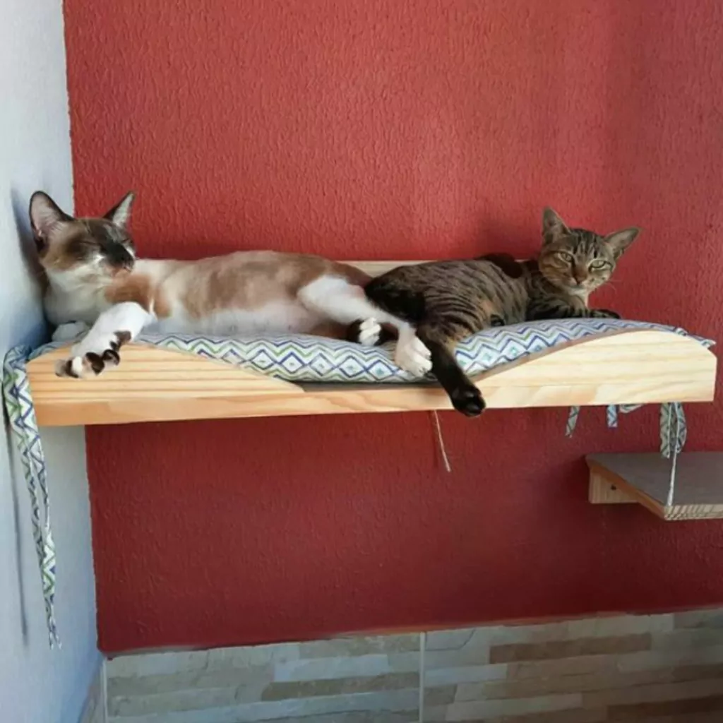 Produto feito em madeira de pinus lixada com forração na parte superior (antiderrapante/para afiar as unhas) na cor marrom, acompanha almofada fofinha em tecido 100% algodão com amarração nas pontas (a escolha do tecido é feita de acordo com o estoque via watsapp), acompanha buchas e parafusos (não nos responsabilizamos pela instalação) produto não indicado para área externa (para maior durabilidade) indicamos a instalação em paredes de alvenaria. Esta peça também pode receber revestimento em laminado pet texturizado (material feito à partir da reciclagem de garrafa pet), criando assim peças bicolores (mantendo sempre detalhes em madeira) nas cores preto/branco/amarelo e ou azul claro (VALE LEMBRAR que para opção revestimento existe um valor adicional referente ao serviço, no produto você encontra o botão para clicar caso queira opção revestimento). Produto feito artesanalmente podendo assim ter pequenas variações de tamnho e tonalidade existindo assim um PRAZO PARA A PRODUÇÃO DO PRODUTO de até 15 dias + prazo correio.