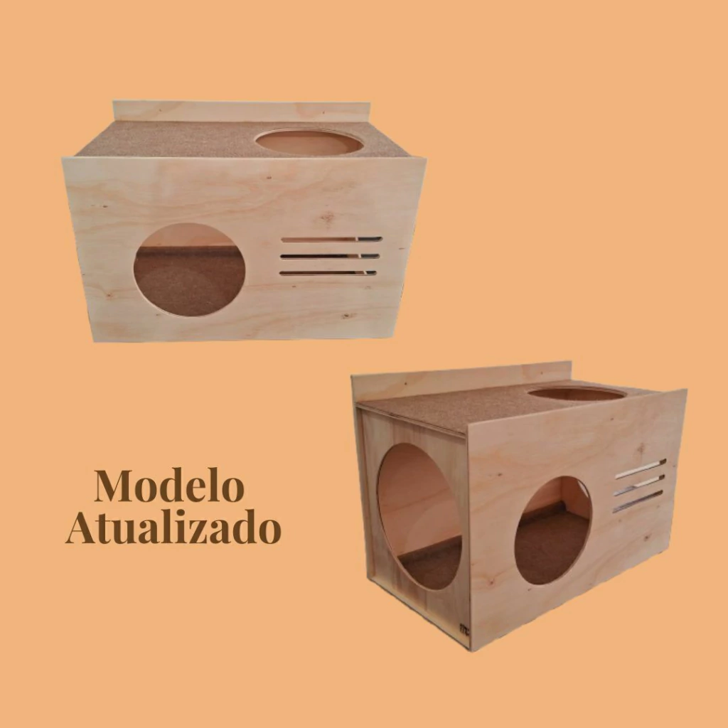 01 Unidade Nicho Big Meu Cantinho (nas Alturas) : feito em madeira de compensado lixada, com forração em carpete na cor marrom na parte superior e na base interna, contém 03 passagens sendo 01 na parte superior. Medidas : altura 35cm comp. 55cm prof. 31cm.